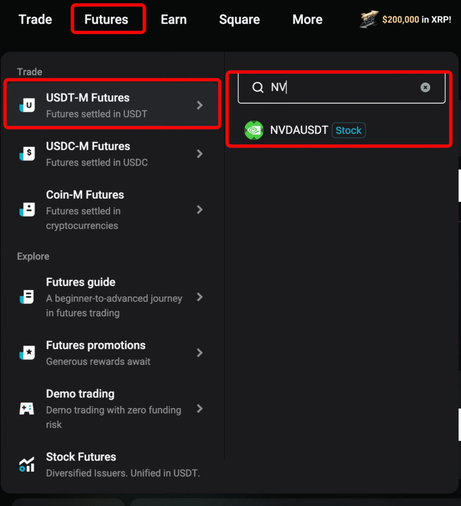 - In the search bar for trading pairs, type the stock ticker you want, for example, “NVDAUSDT.”